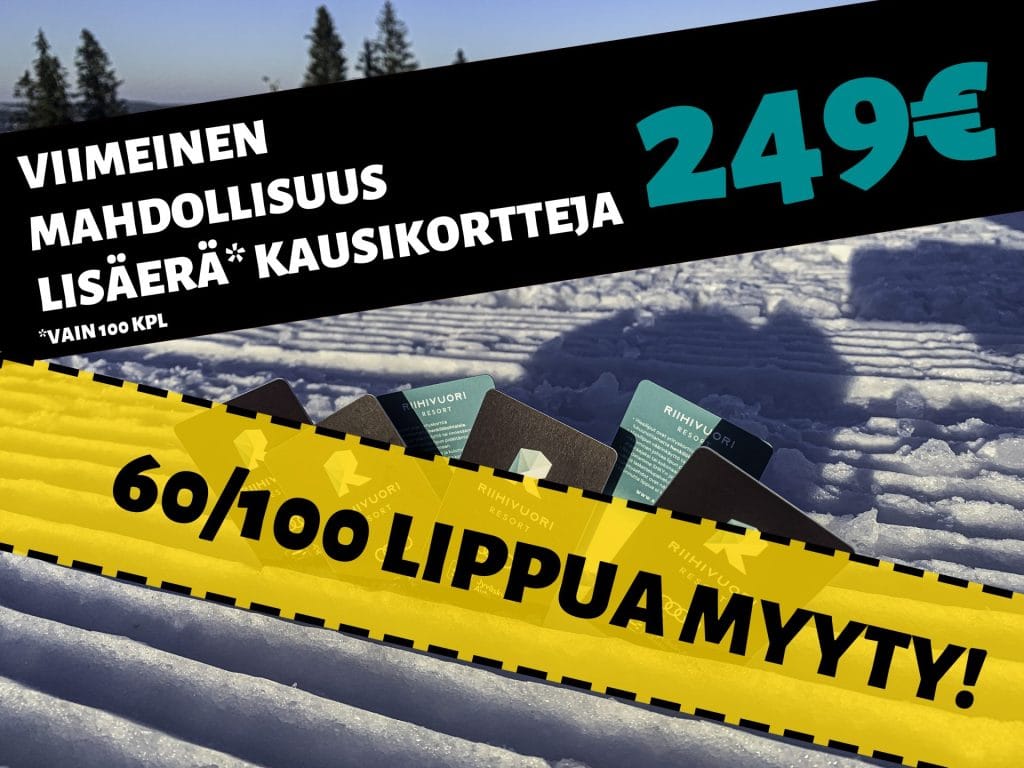 Viime perjantaina myyntiin tulleesta kausikorttikampanjan 100 kappeleen lisäerästä on myyty jo 60, joten jos haluat varmistaa kausarin vielä 249€ hintaan, niin nyt ei kannata jäädä odottelemaan vaan suunnata joko meidän verkkokauppaan tai vuorelle lipunmyyntiin. Verkkokaupassa voit maksaa kotimaisille verkkopankeilla, yleisimmillä luottokorteilla, mobilepaylla ja laskulla. Jos haluat ostaa lipun työnantajan tarjoamilla liikuntaeduilla tai käteisellä tulee se […]